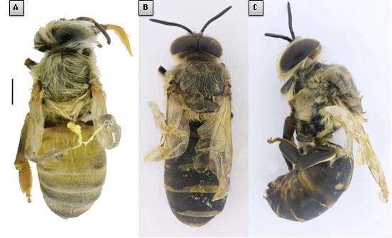 Una vez instalada la infección en la colmena el DWV puede provocar deformidad en las alas de abejas adultas que se infectaron durante su fase pupal, momento en que Varroa destructor introduce grandes cantidades de virus al alimentarse. Estas abejas suelen emerger con alas atrofiadas o arrugadas, abdomen acortado y color más oscuro, incapaces de volar ni participar en las tareas de la colonia (Imagen 1). En consecuencia, se reduce el número de obreras funcionales, pérdida de capacidad de termorregulación y debilitamiento general de la colmena (Lanzi et al., 2006; Martin et al., 2012).
