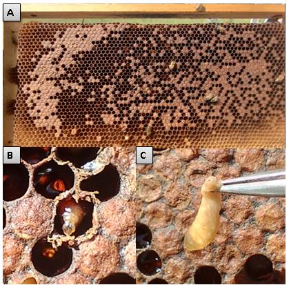 El Virus de las celdas reales negras (BQCV) afecta principalmente a las larvas de reina (Apis mellifera) durante su desarrollo en las celdas reales, provocando su muerte antes de la operculación o poco después. Las larvas infectadas se tornan de color amarillo, luego negras, dando el aspecto característico que da nombre al virus. En abejas adultas puede encontrarse de manera asintomática, pero su replicación se ve favorecida por condiciones de estrés y por la presencia de otros patógenos. Varroa puede actuar como vector mecánico y biológico, facilitando la diseminación del virus dentro de la colonia y aumentando la carga viral en las abejas parasitadas. La presencia de este virus en Argentina tiene una prevalencia baja, sin embargo paises vecinos, como Uruguay, reporta niveles de prevalencia en abejas adultas cercanos al 95%.