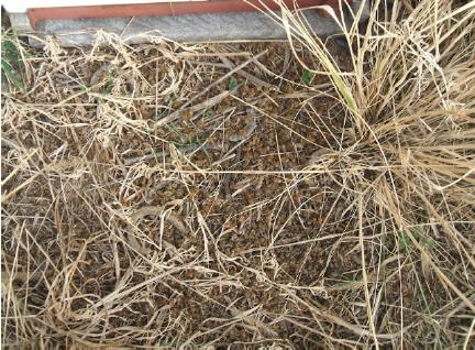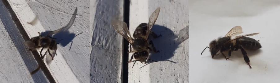 El virus de la parálisis crónica se manifiesta clínicamente en dos formas principales que, aunque distintas, pueden coexistir dentro de un mismo brote. La primera es la forma paralítica, caracterizada por abejas adultas que presentan temblores, dislocación de las alas, descoordinación motora e incapacidad para volar, permaneciendo agitadas en la piquera o en el piso de la colmena. En estos individuos suele observarse un abdomen distendido y pérdida progresiva de la capacidad de vuelo hasta que finalmente mueren (Budge y col., 2020; Ask IFAS, 2023). La segunda forma, conocida como “greasy” o de alopecia, se reconoce por la apariencia oscura y brillante del tegumento, debido a la pérdida de los pelos del cuerpo (Imagen 3). Estas abejas muestran un aspecto grasiento, diferente del brillo natural del exoesqueleto, y en etapas iniciales pueden volar, pero con el tiempo desarrollan debilidad, desorientación y caen cerca de la colmena. Además, estas abejas frecuentemente no son reconocidas como propias por la colonia, lo que lleva a las obreras a expulsarlas de la colmena, lo que se conoce como el “síndrome de los ladrones negros”.