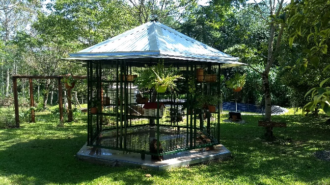 Uno de estos Meliponarios es múltiple, que, como se puede observar en la figura 1, consiste en una estructura metálica recubierta con malla en todas sus caras. En su interior se encuentran dispuestas hileras de estantes donde se alojan las colmenas. El techo es de cinc brinda protección frente a la lluvia, y sus cuatro patas tiene dispositivos de protección contra hormigas.