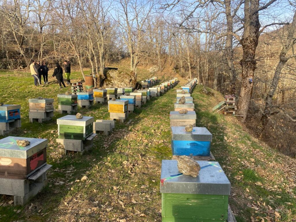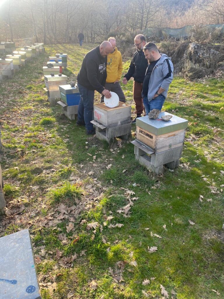 Para cerrar la visita, varios de los invitados pudieron recorrer algunos apiarios, donde se pudo observar el ordenamiento de los mismos y un gran movimiento de abejas, por los primeros días de sol a fines del invierno español.